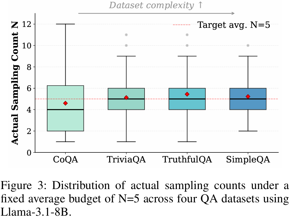 Dynamically terminates sampling once posterior variance falls below threshold γ. Simple queries converge quickly; complex queries receive additional exploration— achieving ≈50% sample reduction in low-budget settings.