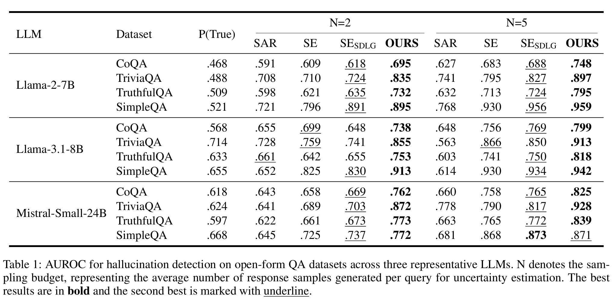 AUROC on four QA datasets across three LLMs (higher is better)